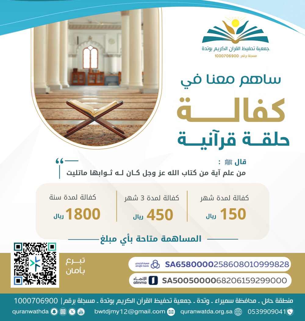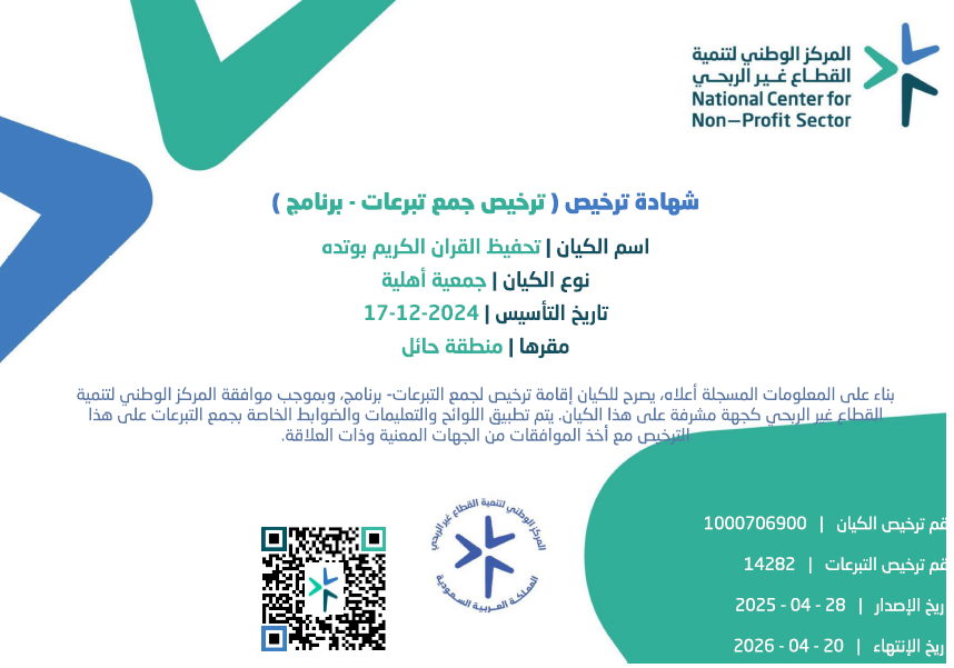 جمعية تحفيظ القرآن الكريم بوتدة عن الجمعية جمعية تحفيظ القرآن الكريم بوتدة، جمعية أهلية غير ربحية تحت إشراف المركز الوطني لتنمية القطاع غير الربحي ومسجلة برقم (1000706900). تعرف علينا رؤيتنا رسالتنا قيمنا